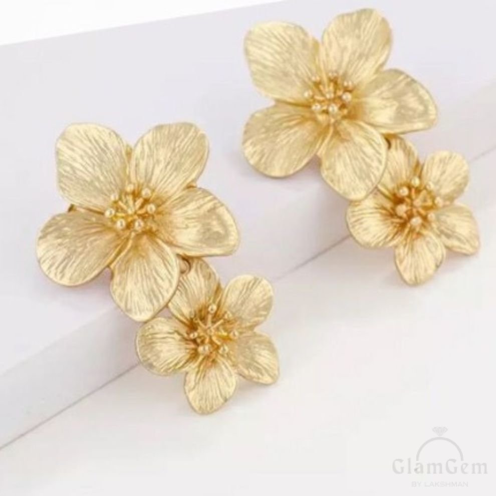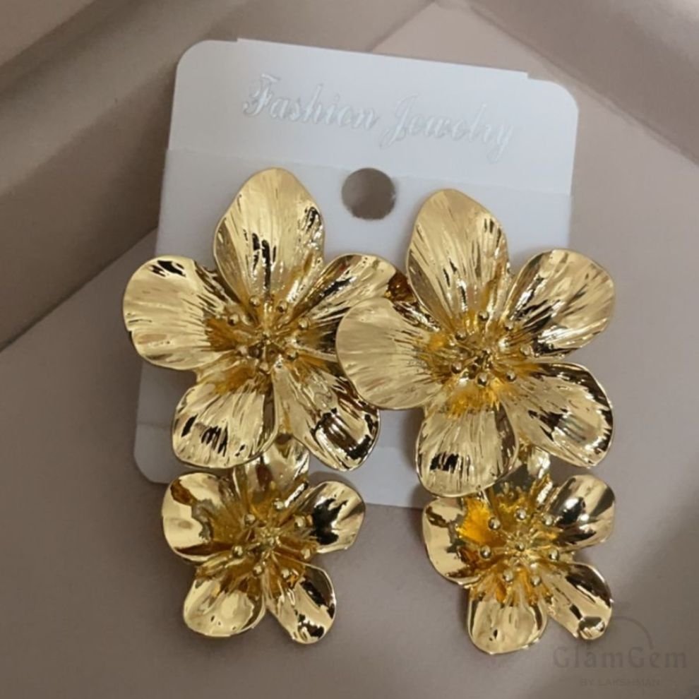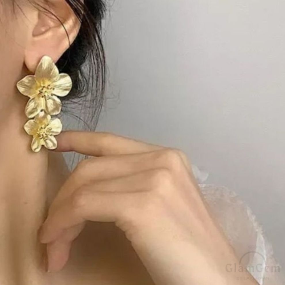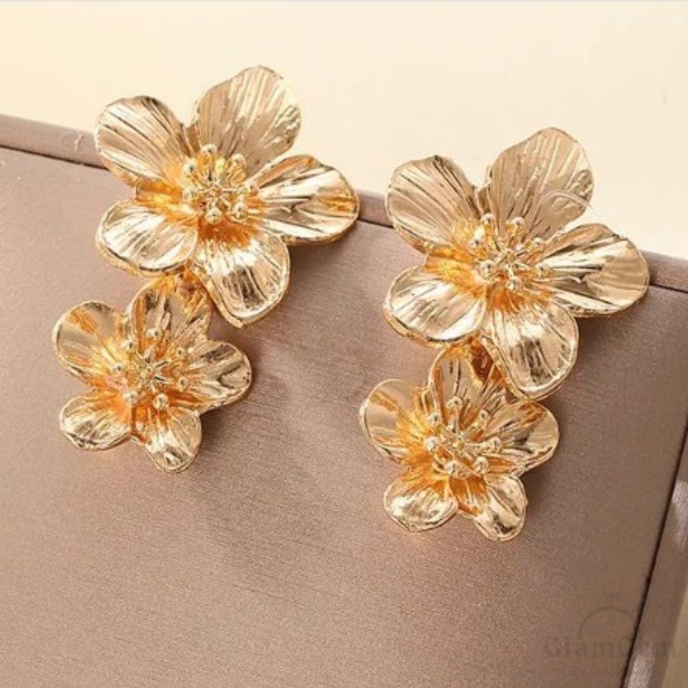 These elegant double flower earrings boast bold, statement-making design with intricately detailed petals. Their sophisticated style features layered blooms in rich hues, perfect for adding a touch of glamour to any outfit.