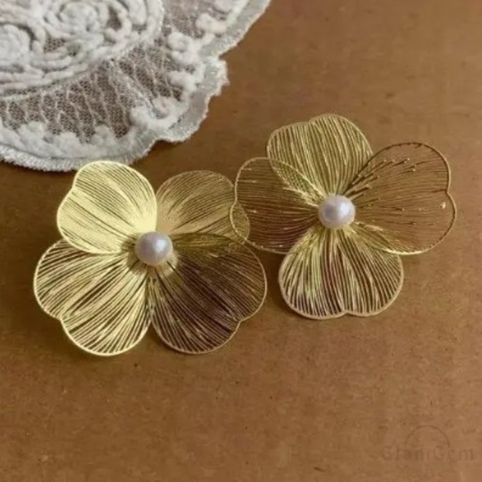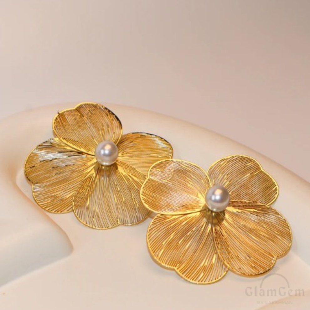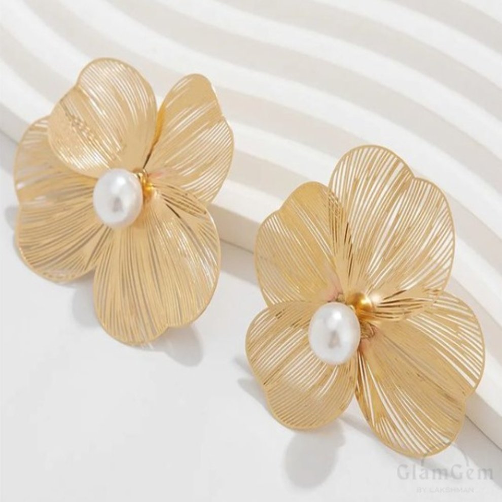 These are a stunning pair of statement jewelry pieces that beautifully combine the allure of nature with sophisticated design. These earrings feature intricately crafted petals made of gold-colored metal, designed to resemble delicate flowers in full bloom. At the center of each flower is a luminous faux pearl, adding a touch of classic elegance and a striking focal point to the design. The fine lines and detailed craftsmanship of the petals create a textured, three-dimensional effect that captures light beautifully, enhancing the overall shine and elegance of the earrings. Perfect for both special occasions and everyday wear, these earrings are a versatile addition to any jewelry collection, offering a blend of modern style and timeless beauty