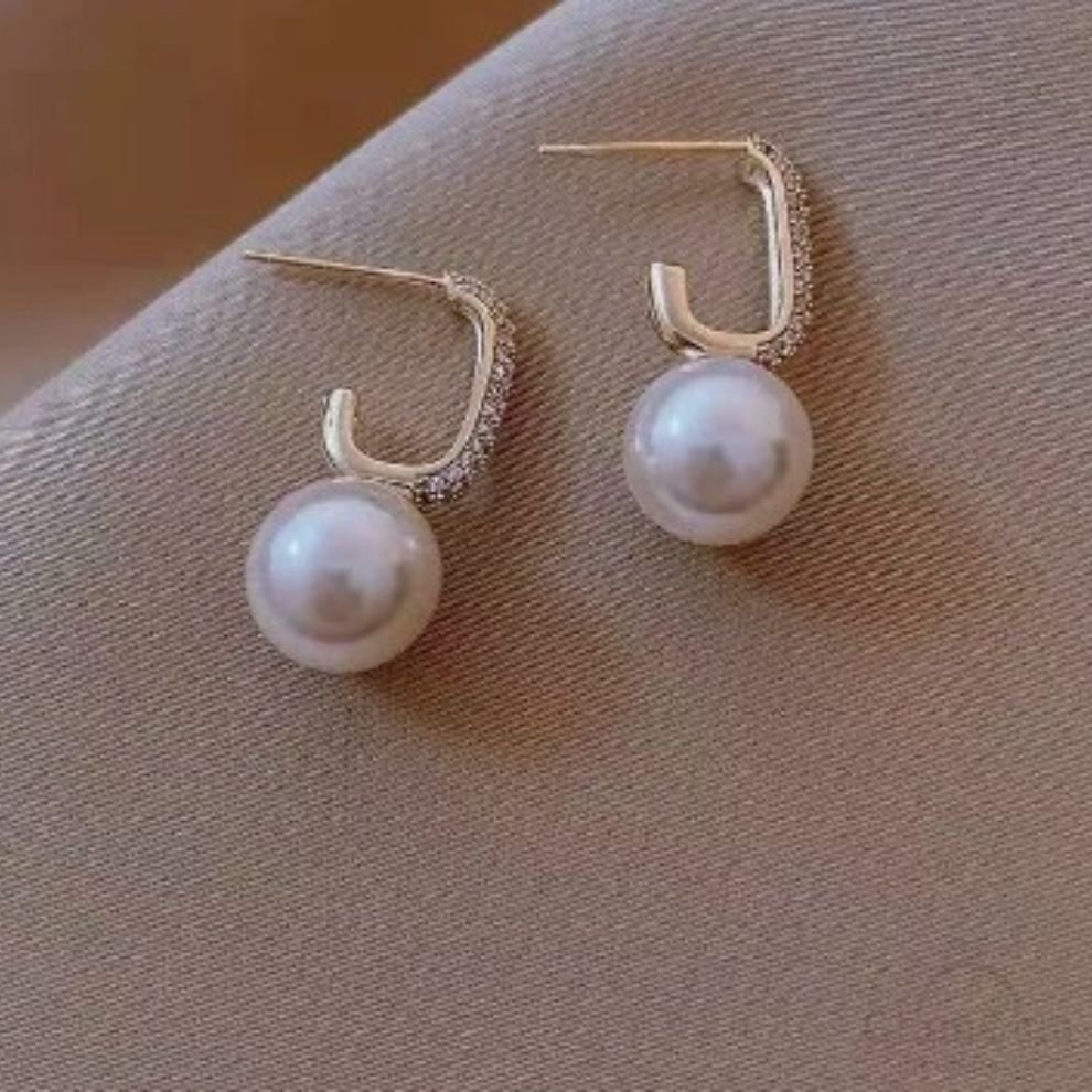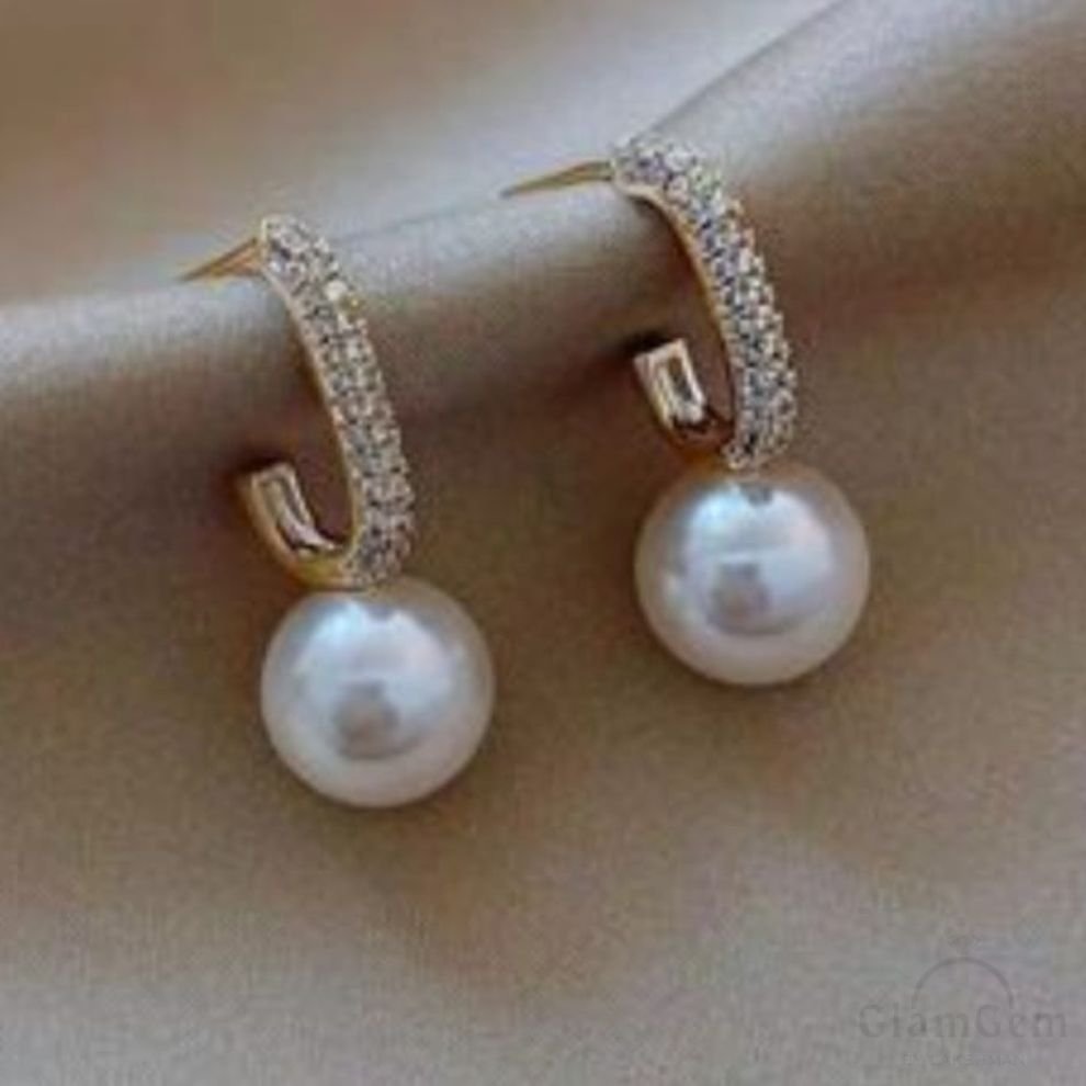 Elegant zircon-studded earrings featuring lustrous white pearls, perfect for adding a touch of sophistication and sparkle to any outfit.